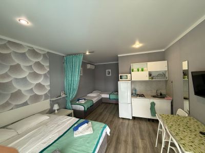 Наш гостевой дом рад принять гостей в нашем уютном доме, в котором всего 12 номеров, что обеспечит вам тихий спокойный отдых. Все наши номера - четырёхместные студии. В номере большая двуспальная кровать и две односпальные. Кровати с ортопедическими матрасами и белоснежным бельём с полотенцами, с одноразовыми тапочками, а также сплит. Система (кондиционер). Зона кухни оборудована двухконфорочной газовой плитой, электрическим чайником, микроволновкой, двухкамерным холодильником. Вся посуда рассчитана на 4 человека.